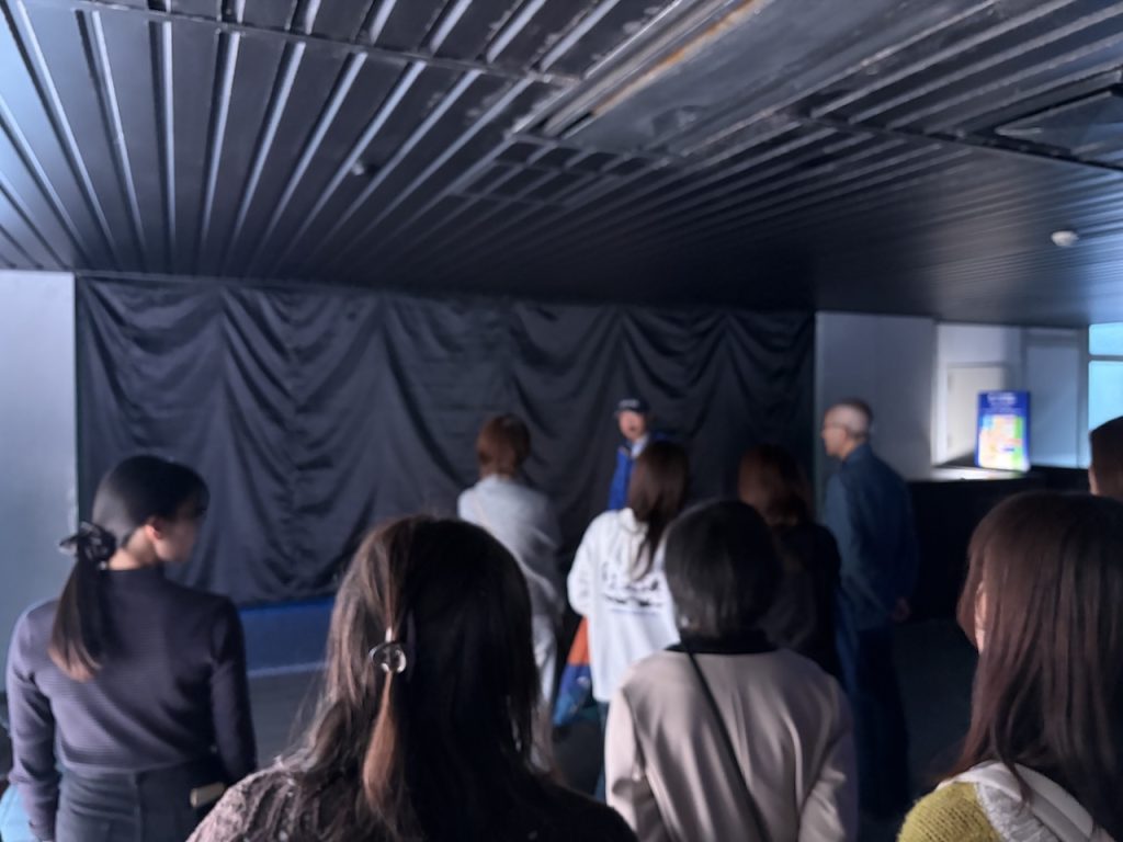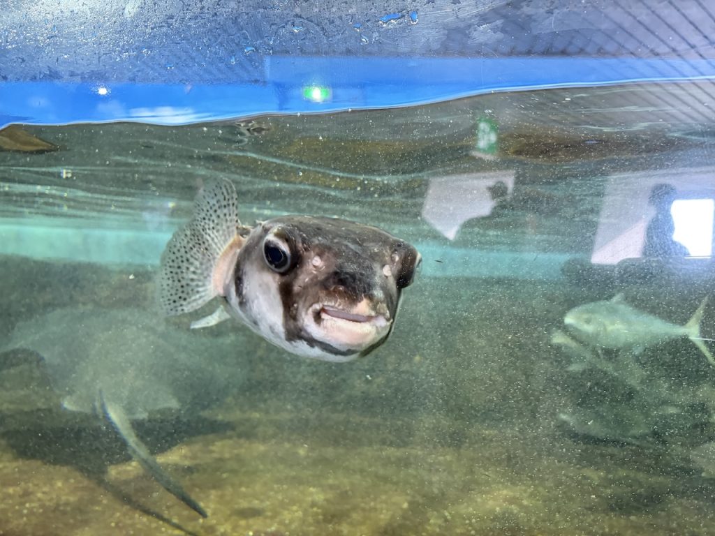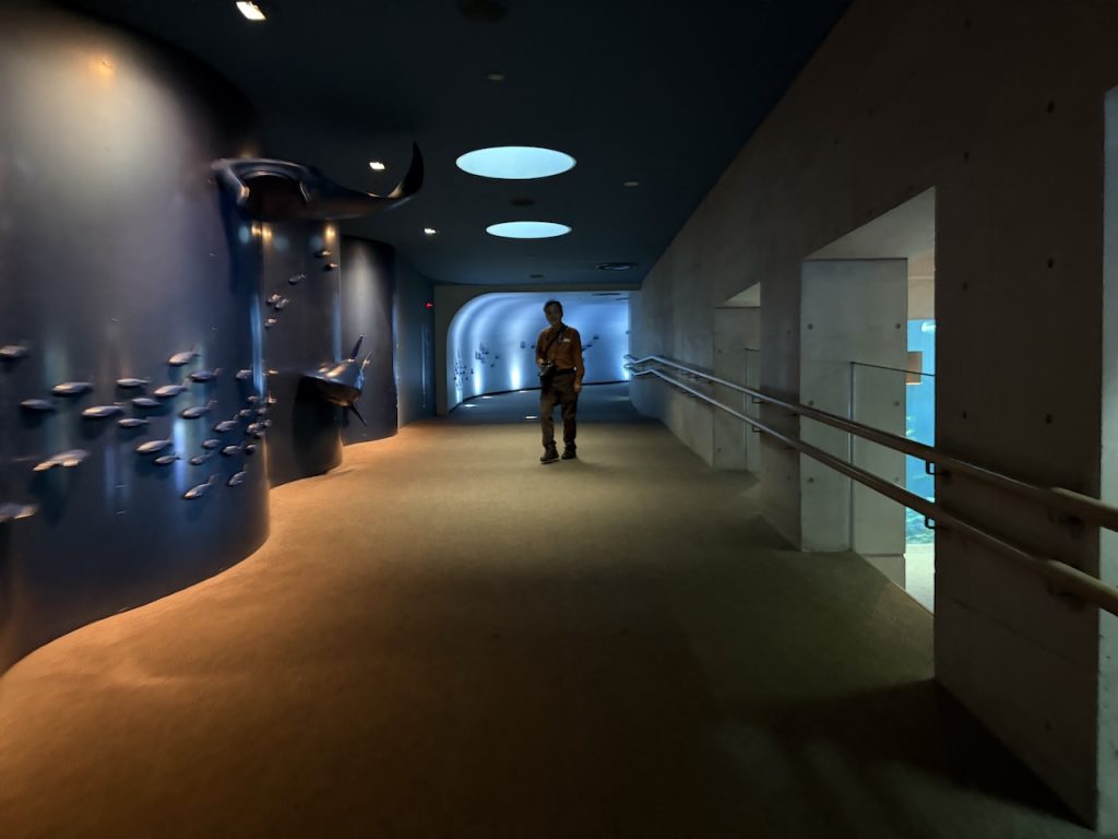 まんぼうは、夜の警備員さんの足音や懐中電灯に敏感に反応してストレスを感じるそうで、水槽に黒い幕がかけられていました。