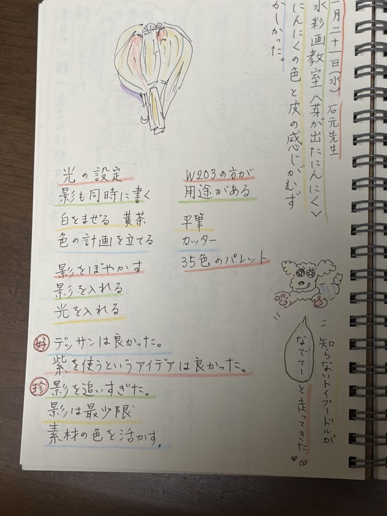 美術部の頃は私の絵の良さは配色だと言われていましたが、今回の教室では先生二人ともに「デッサンの目」がいい、と言われて嬉しいです。