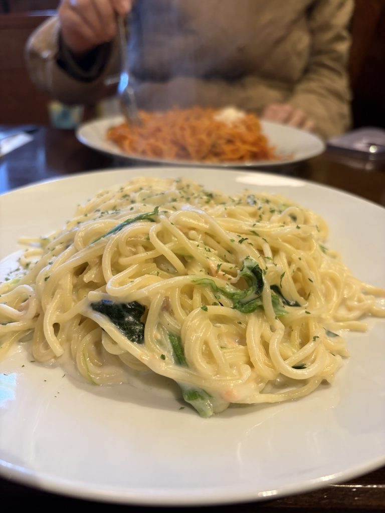 午後から一人で用事があった日。ペペロンチーノを二人で食べに行きました。