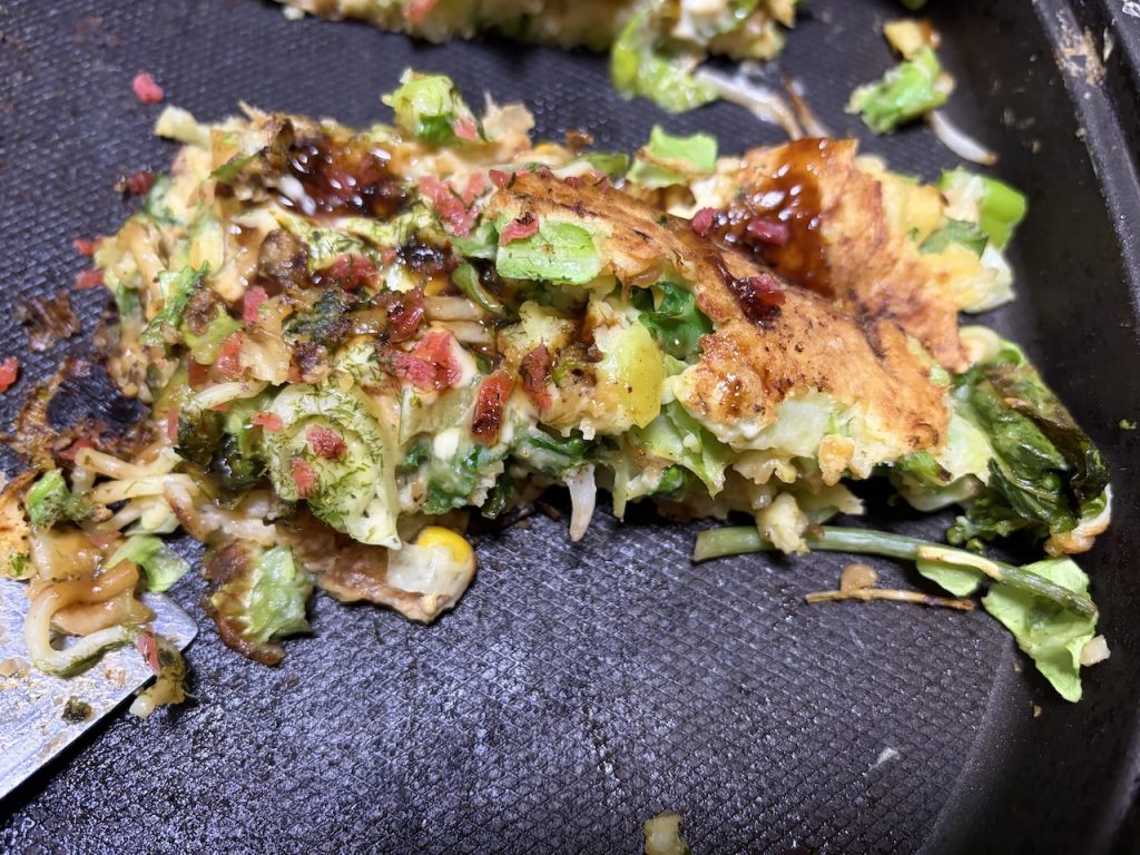 夜は久しぶりにお好み焼きを作りました。いろいろな葉っぱを入れてみました😉