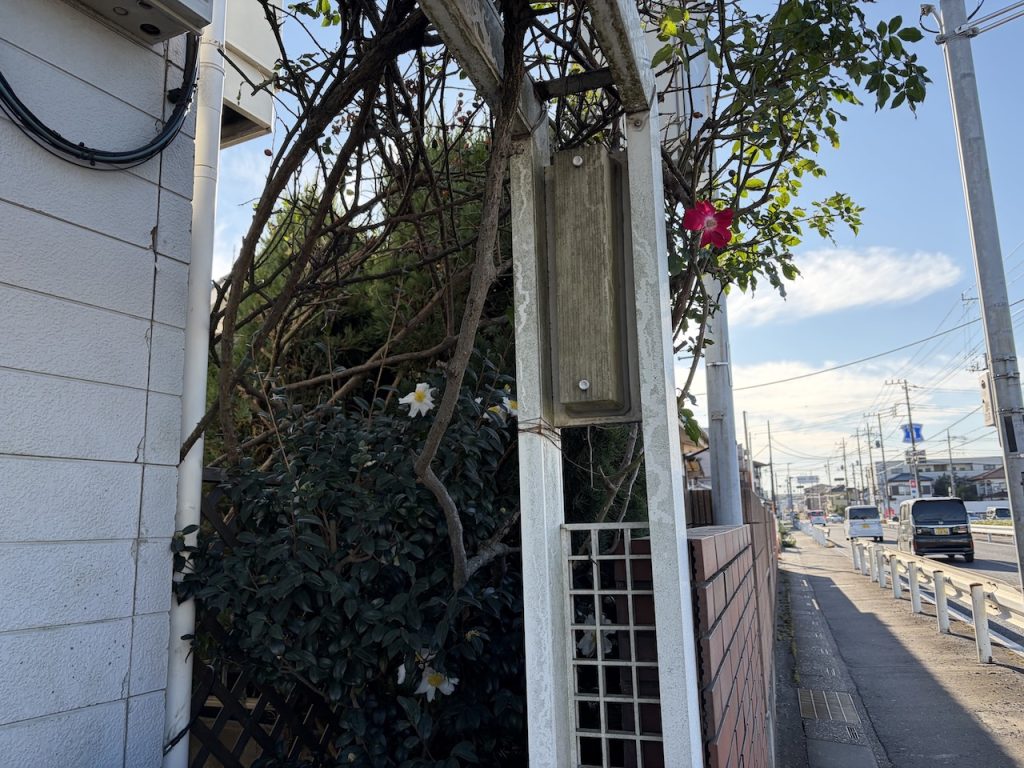 近くに赤い薔薇のアーチがかわいいアパートがあるのですが、裏側に白い花も咲いていました。