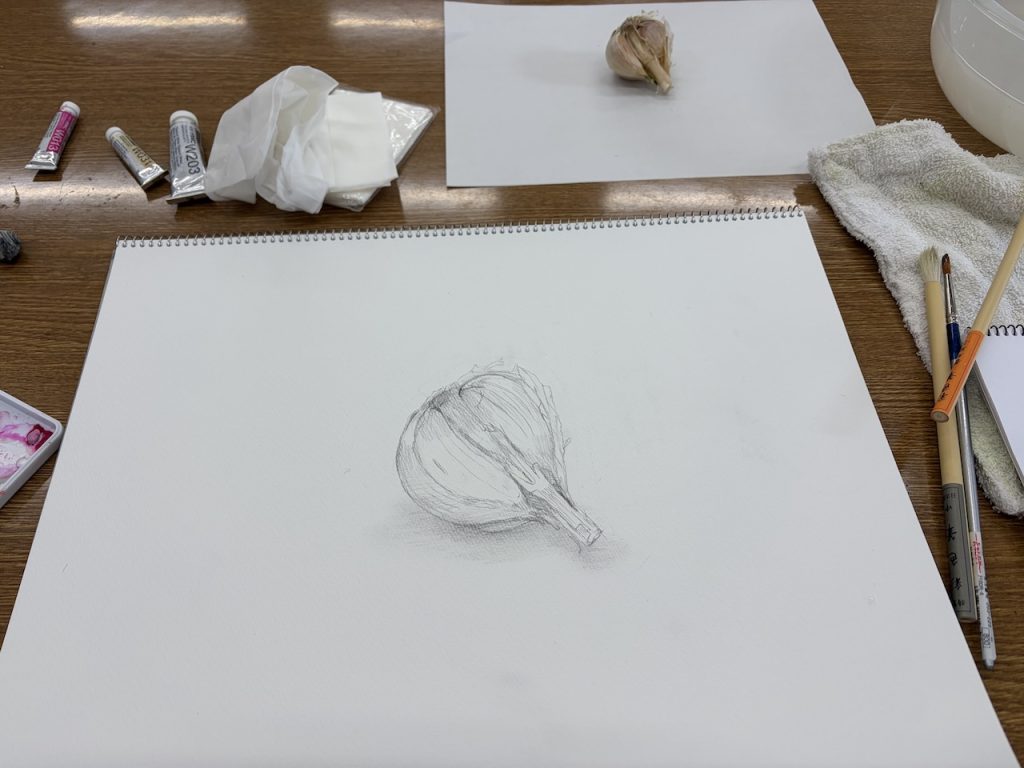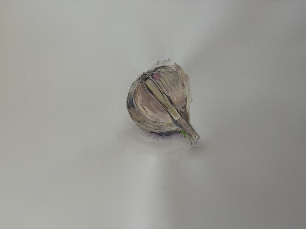 今回選んだのは使いかけのニンニクです。少し芽が出てきたので描いてみたい、と思いました。