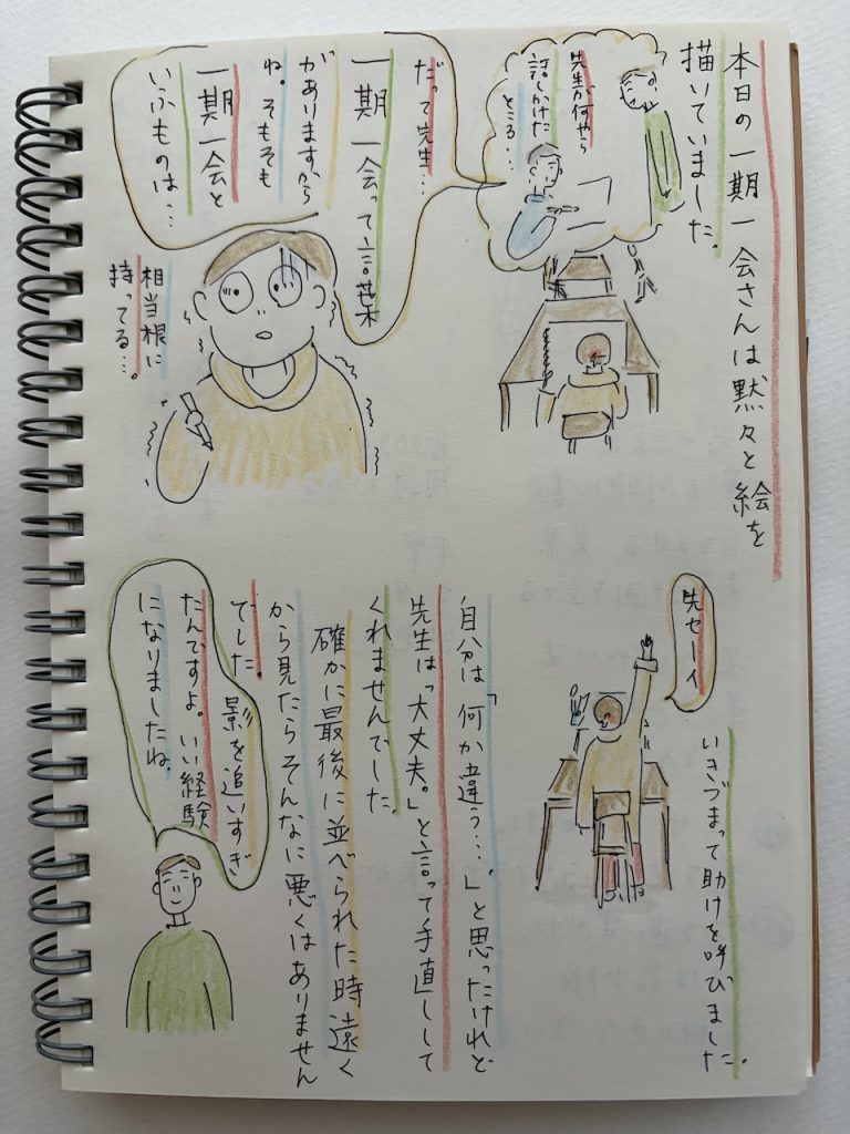 一期一会さんは珍しく黙々と絵を描いていました。にぎやかさんが欠席をしているから、お話し相手がいないのかもしれません。