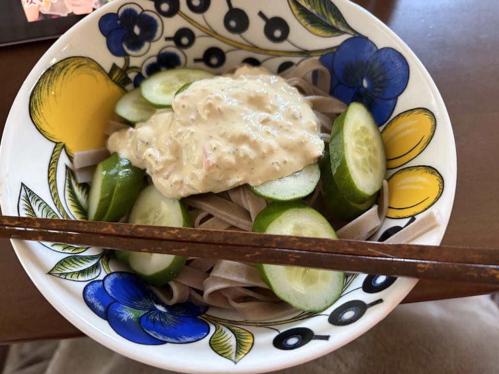 お昼、残ったそばパスタで、タルタルソースが合うか試してみました。
