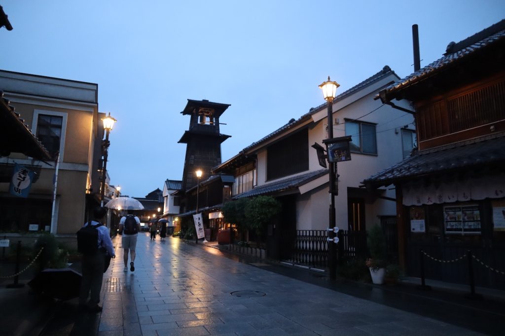 最後にお寺の講堂での演舞が予定されていましたが、広さに対して待っている観客が多く、入れたところでとても見られそうにありません。雨が強くなったので、お寺の鐘のある建物で雨宿りをして夕食のお店を探しました。