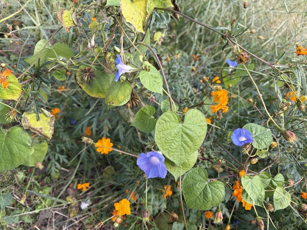 寒いのに咲いている豆朝顔が健気です。可愛い❤️