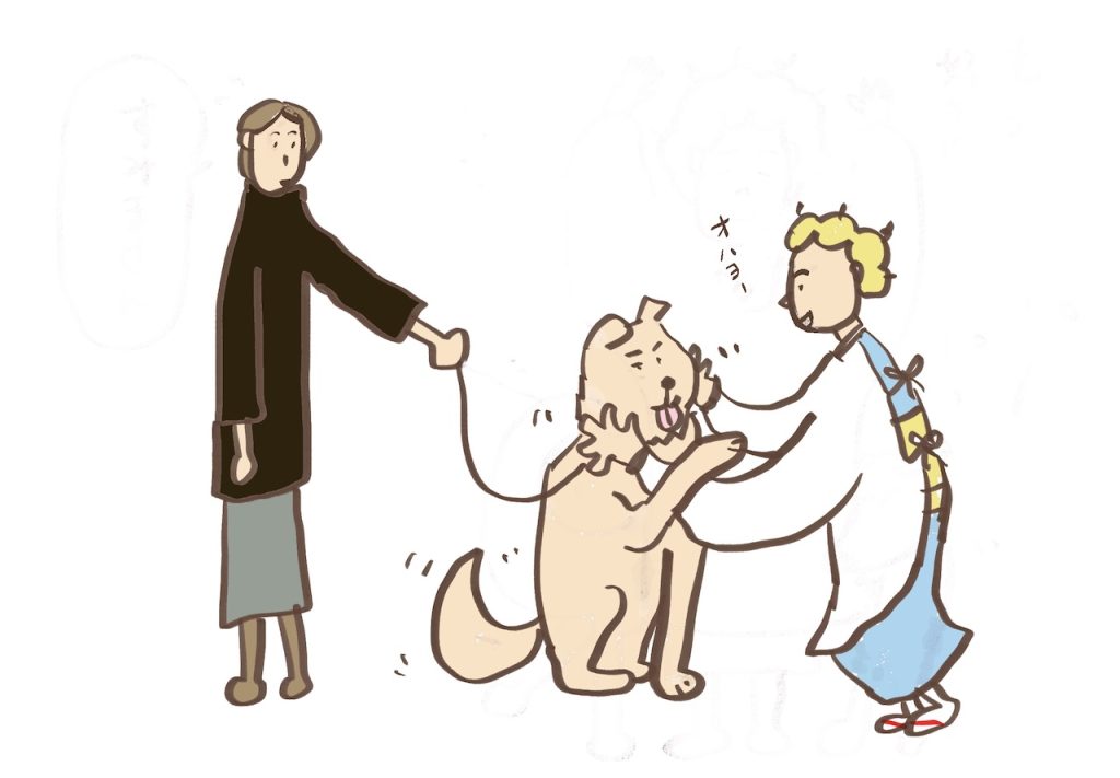 🐕は撫でてもらえそうと察知し、すごい「いい子アピール」が始まりました。でも下心が見え見えです。