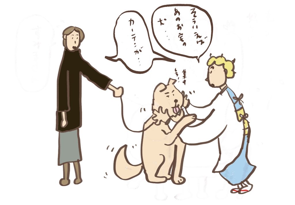 いつも窓際でゴロゴロしているご近所のわんこさんが、ある日カーテンをやぶり、それがそのまま放置されているのですが、、、。